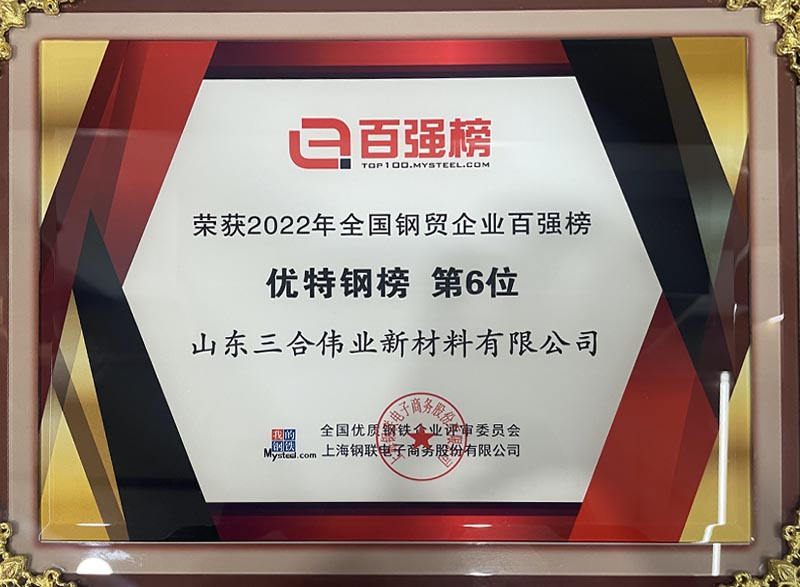 山東三合偉業(yè)新材料有限公司獲評2022年全國鋼貿(mào)企業(yè)百強榜